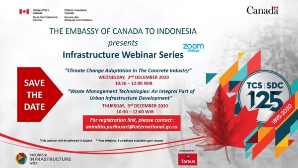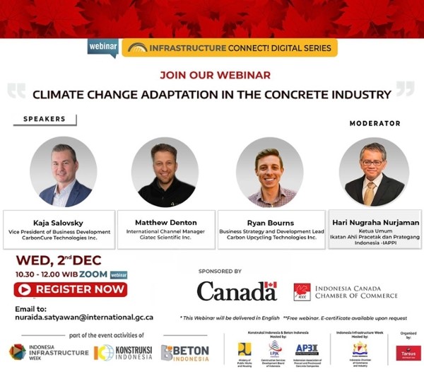 In conjunction with the Indonesia Infrastructure Week 2020, the Embassy of Canada to Indonesia and Timor Leste invites you to join a free webinar on Climate Change Adaptation in the Concrete Industry which will be organized on Wednesday, 2 December 2020 at 10.30 AM to 12.00 PM (WIB).
