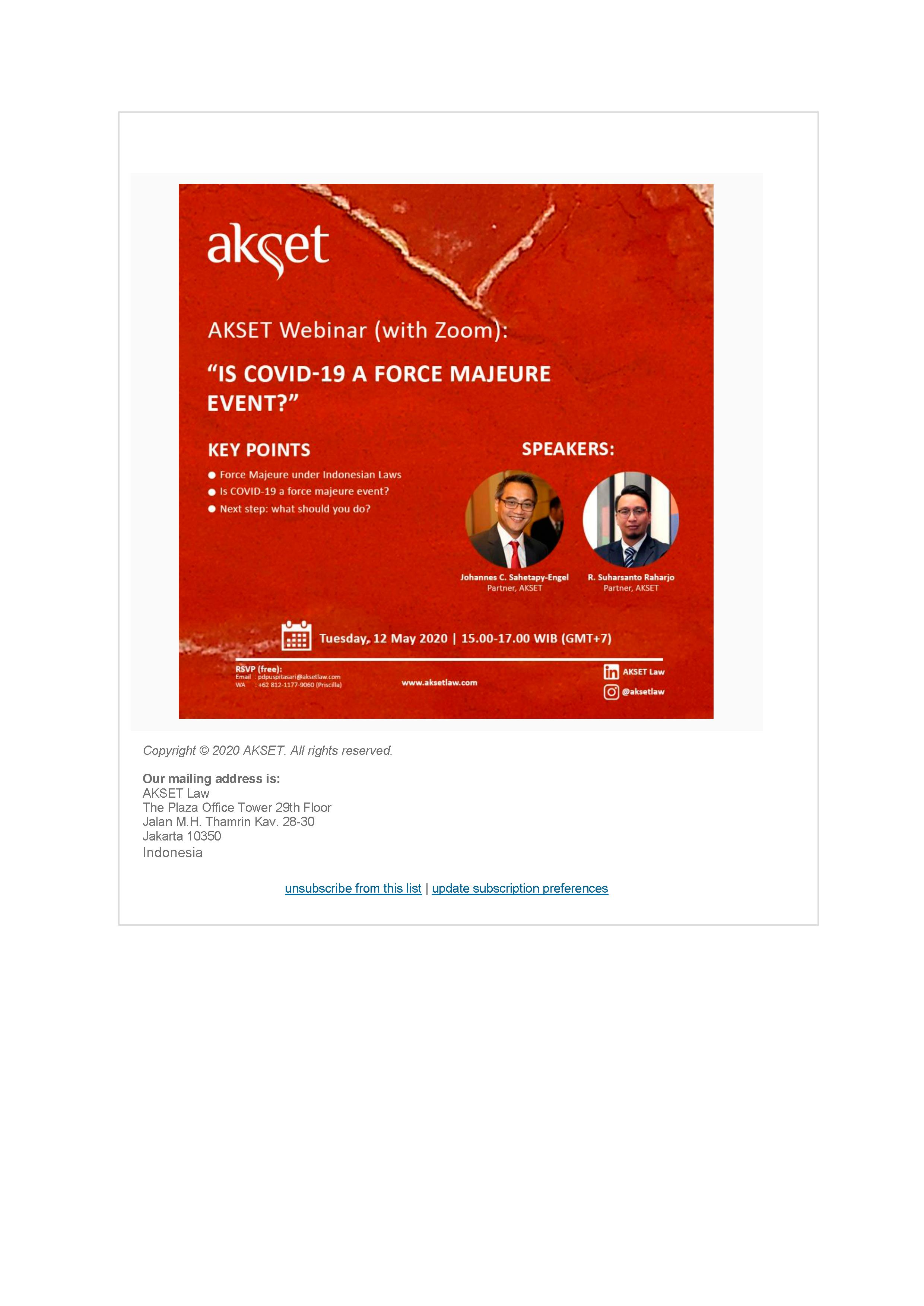 AKSET presents its first webinar with the topic Force Majeure related to Covid-19 outbreak. The webinar will be presented by our partners, Mr. Johannes Sahetapy-Engel and Mr. Suharsanto Raharjo from our Litigation and Employment practice.