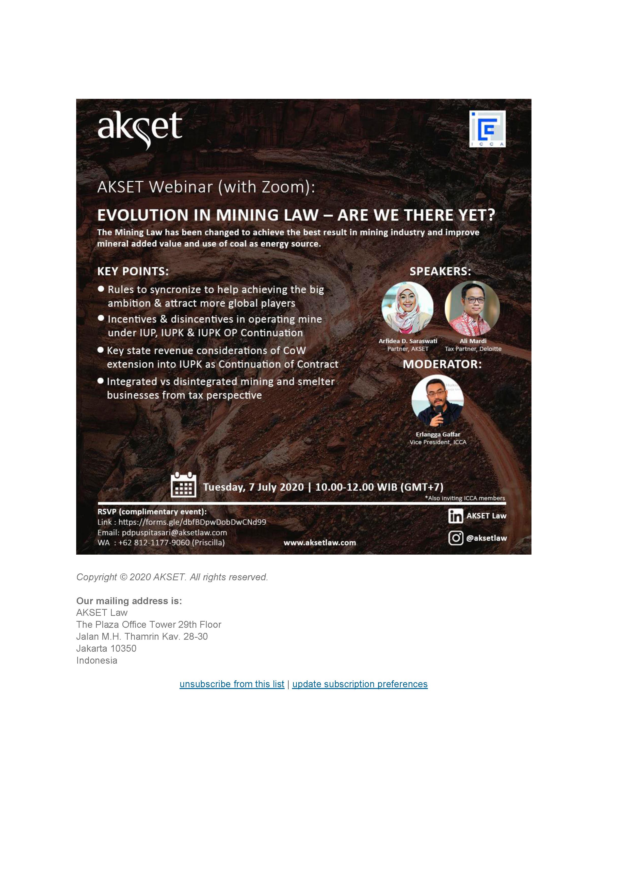 We are pleased to inform you that AKSET will present a complimentary webinar titled: "Evolution in Mining Law – Are We There Yet?”.