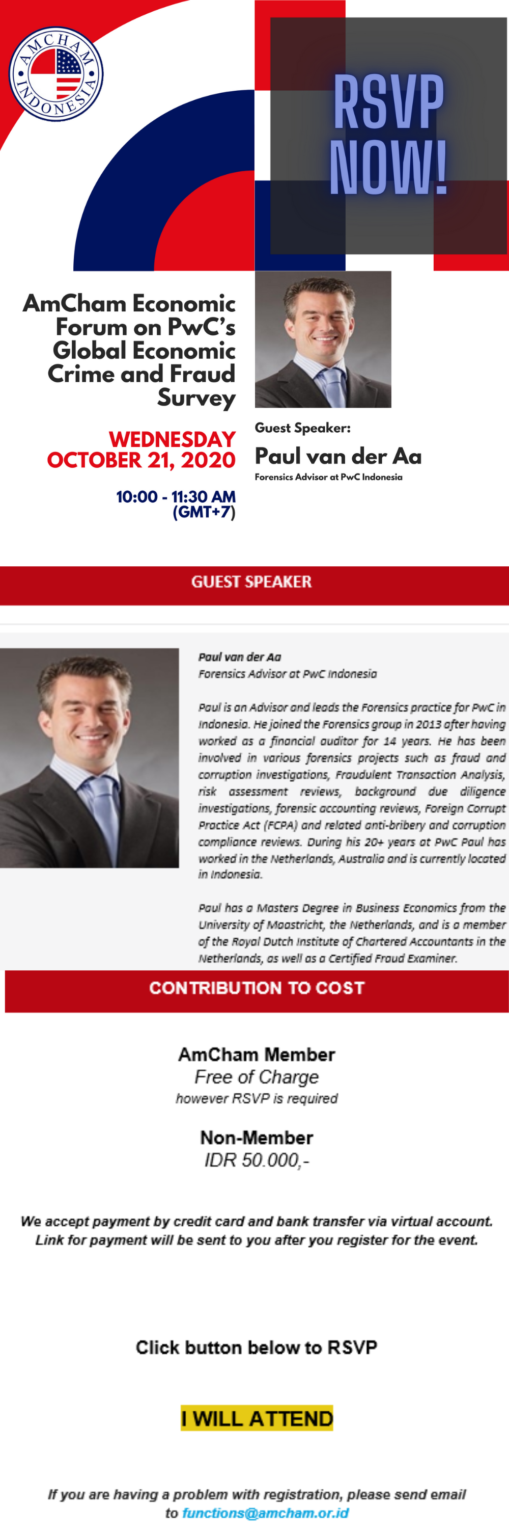 Please join us for October’s edition of the Economic Forum featuring Paul van der Aa, Forensics Advisor from PwC, which will be moderated by Gusti Kahari – AmCham Government Relations Director.