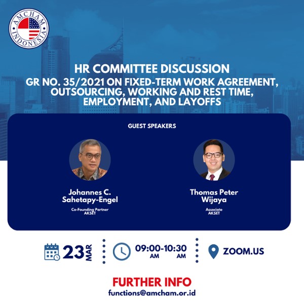 Dear AmCham Members & Friends, For our second HR Committee meeting we will be discussing the new regulation No. 35/2021 on Fixed-Term Work Agreement (PKWT), Outsourcing, Working and Rest Time, Employment, and Layoffs (PHK). Our speakers from AKSET Law will provide a side-by-side analysis of this new regulation.