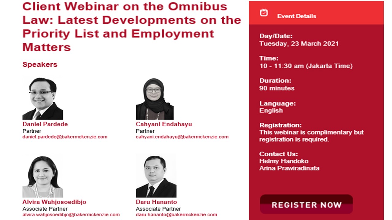 Following the introduction of the Omnibus Law and the recent issuance of various implementing Presidential Regulations, including the Priority List, we are pleased to invite you to join our webinar discussing the latest developments on Tuesday, 23 March 2021.