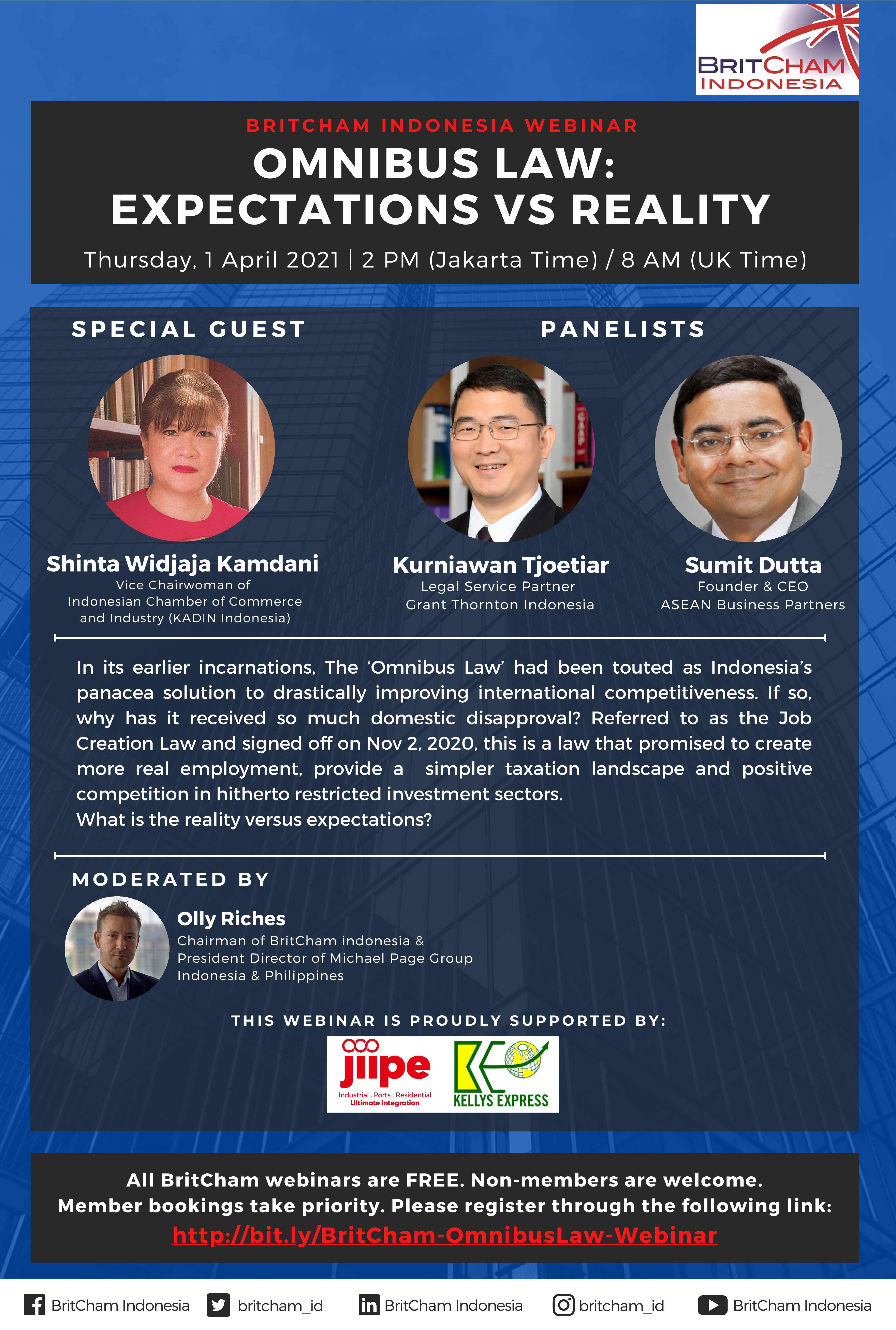 We are pleased to announce that on Thursday, April 1 at 14.00 WIB, our Legal Partner, Kurniawan Tjoetiar will be speaking on “Omnibus Law: Expectations vs Reality” webinar conducted by BritCham Indonesia.