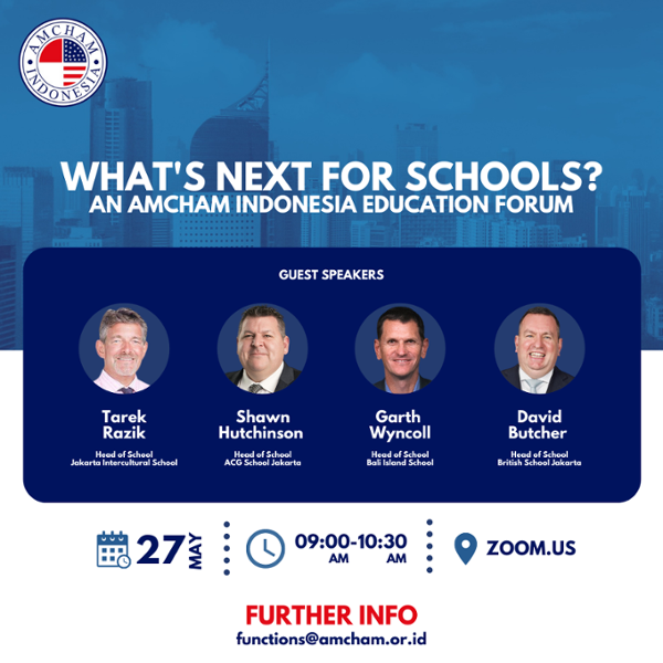 Dear AmCham Members and Friends, The government recently conducted a pilot project for school re-opening, but the future of face-to-face learning is far from certain. Please join us for an AmCham Education Forum on the prospects for blended and in-person learning, the results of the pilot project and how schools are coping with Covid-19. This will be a valuable forum for companies and parents as we look at what to expect next school year from Indonesia's private schools.