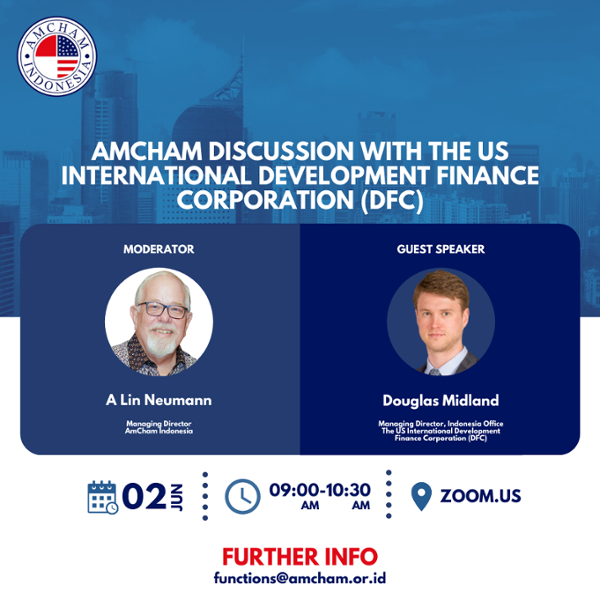 Dear AmCham Members and Friends, AmCham Indonesia cordially invites you to participate in an upcoming discussion with Douglas Midland, Managing Director for the Indonesia office of the US International Development Finance Corporation (DFC).