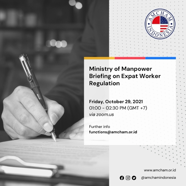Dear AmCham Members, AmCham Indonesia’s Human Resources Committee, in collaboration with the Ministry of Manpower, will host a Ministry of Manpower Briefing on Expat Worker Regulations, on Oct 29.