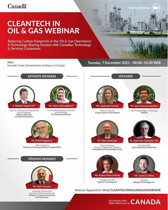 The Embassy of Canada in Indonesia and Timor Leste are pleased to invite you to attend the Cleantech in Oil & Gas webinar, which will be held virtually on Tuesday, December 7th , 2021, from 8.00am to 10.30am WIB.