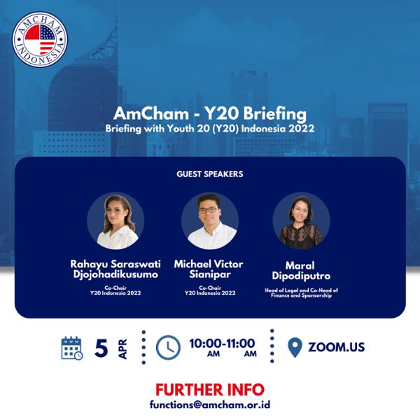As part of AmCham's ongoing support for Indonesia’s G20 Presidency and its engagement groups, we are very pleased to partner with Youth 20 (Y20) and Indonesian Youth Diplomacy (IYD) to provide our members with details on how they can work together with the Y20 and support the voice of today’s youth. Meet with the Y20 organizers to get insight on Y20’s agenda, how your organization can get involved, and directly ask questions to the leaders of tomorrow!