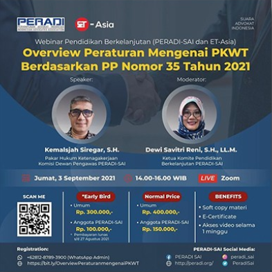 Webinar Pendidikan Berkelanjutan (PERADI SAI dan ET-Asia): Overview Peraturan mengenai PKWT berdasarkan PP Nomor 35 Tahun 2021