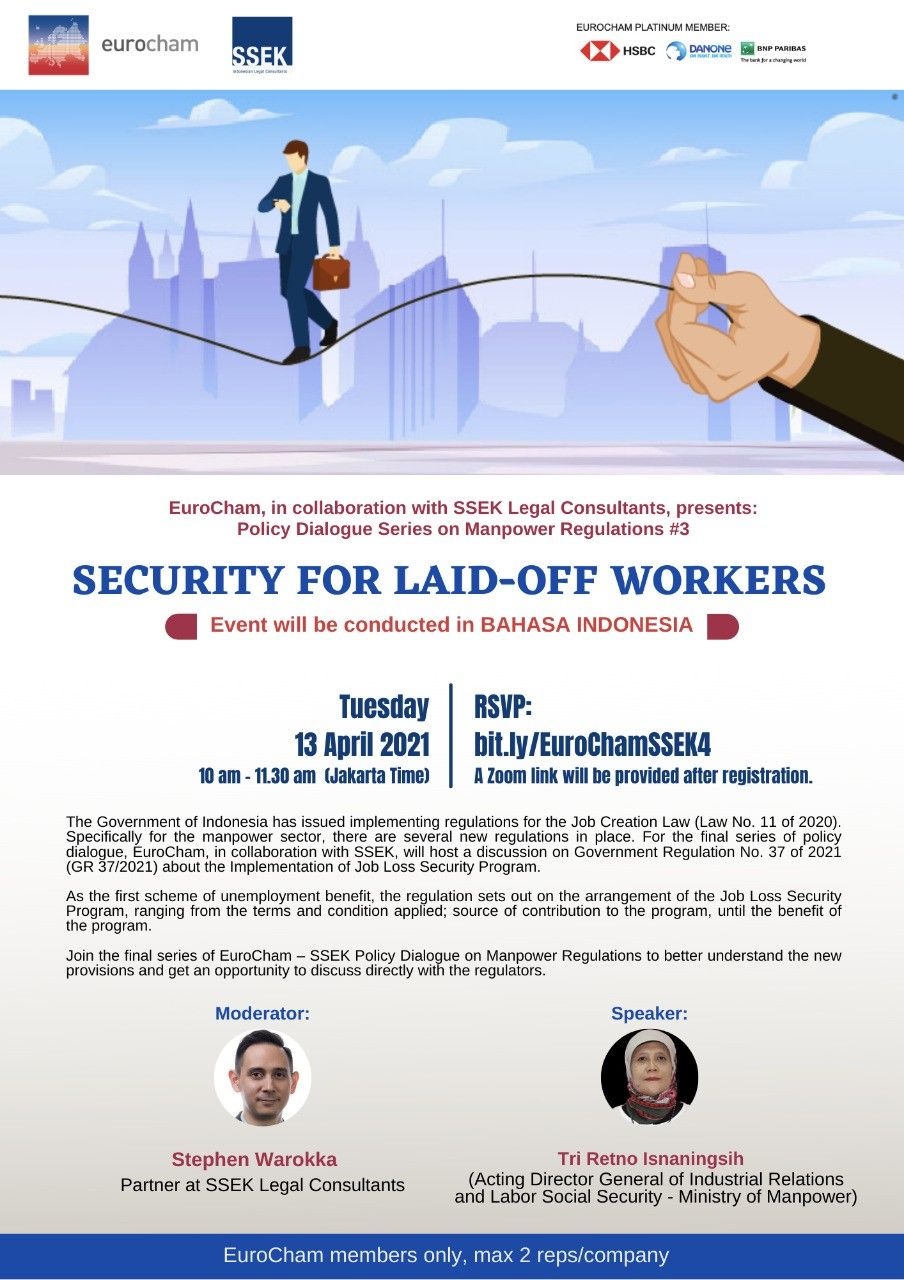 • The Government of #Indonesia has issued implementing regulations for the Job Creation Law (Law No. 11 of 2020). Specifically, for the manpower sector, there are several new regulations in place. For the final series of policy dialogue, EuroCham Indonesia, in collaboration with SSEK, will host a discussion on Government Regulation No. 37 of 2021 (GR 37/2021) about the Implementation of Job Loss Security Program.