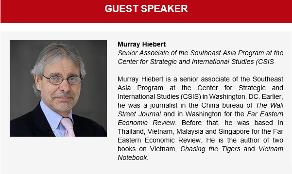 • Dear AmCham Members and Friends, We invite you to join us to a discussion with Murray Hiebert, a Senior Associate (non-resident) of Southeast Asia Program for Center for Strategic & International Studies (CSIS) and the author of “Under Beijing’s Shadow: Southeast Asia China Challenge”, on Thursday, March 18.