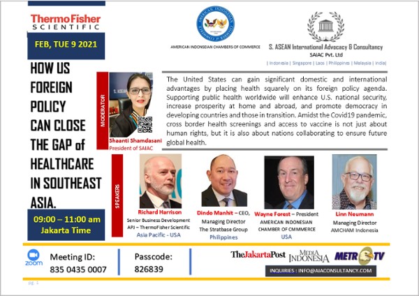 • Dear AmCham Indonesia Members, We are delighted to share the below invitation. The United States can gain significant domestic and international advantages by placing health squarely on its foreign policy agenda. Supporting public health worldwide will enhance U.S. national security, increase prosperity at home and abroad, and promote democracy in developing countries and those in transition. Amidst the Covid19 pandemic, cross border health screenings and access to vaccine is not just about human rights, but it is also about nations collaborating to ensure future global health.
