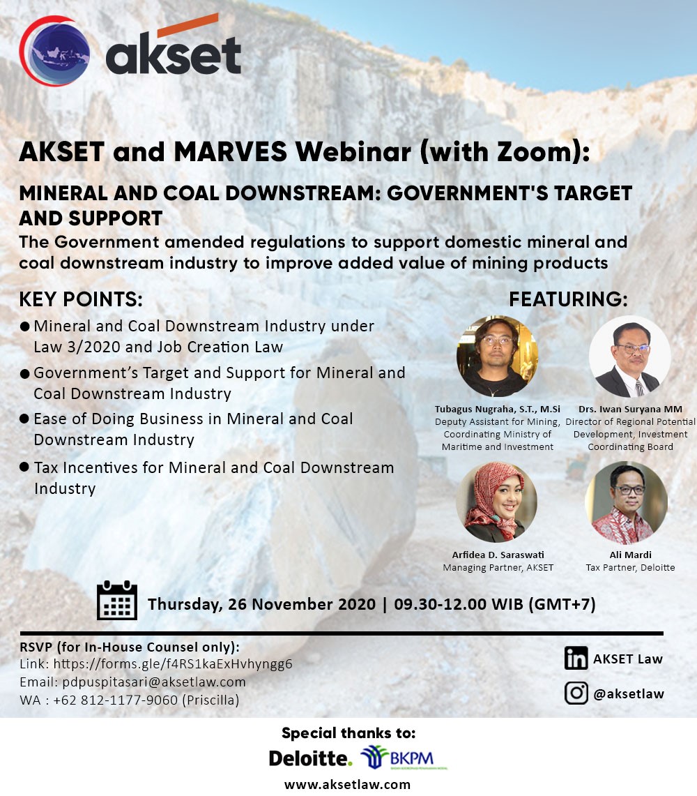 • We are pleased to invite you to join AKSET complimentary webinar titled: “Mineral and Coal Downstream: Government’s Target and Support”. Date : Thursday, 26 November 2020 Time : 09.30-12.00 WIB (GMT+7)