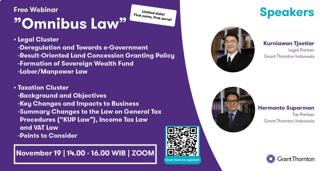 • We would like to invite you to join us together in our webinar "Omnibus Law" on Thursday, 19 November 2020, at 2pm - 4pm wib.