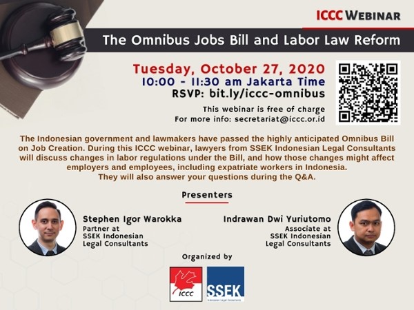 • SSEK Legal Consultants will be featured at an Indonesia Canada Chamber of Commerce (ICCC) webinar discussion focusing on possible changes in labor provisions under the Omnibus Bill on Job Creation. The webinar is scheduled for Tuesday, October 27, beginning at 10 am.