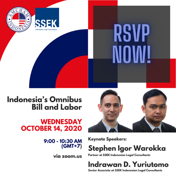 • AmCham Indonesia, in collaboration with SSEK Indonesian Legal Consultants, will host a webinar discussion focusing on possible changes in labor provisions of the Omnibus Bill on Job Creation on October 14.