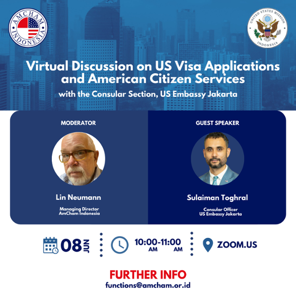 We cordially invite you to join our virtual discussion with the Consular Section of the US Embassy Jakarta scheduled to be held on Wednesday, Jun 8, 2022 at 10:00-11:00 WIB.