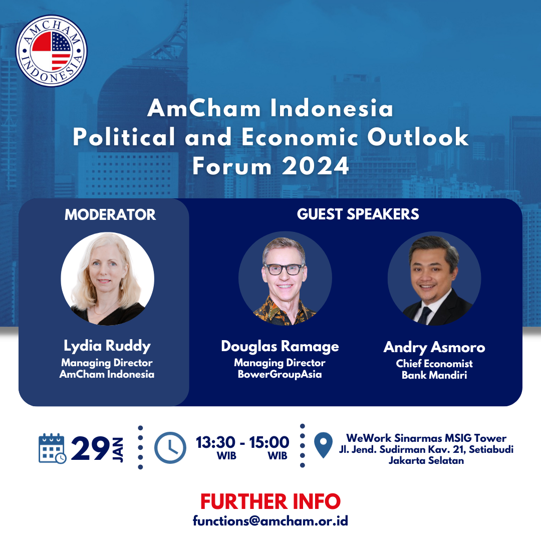 Cancellation must be in writing via e-mail to functions@amcham.or.id latest by noon on Friday, January 26, 2024. Please be advised that ‘no-shows’ may be billed at full price.