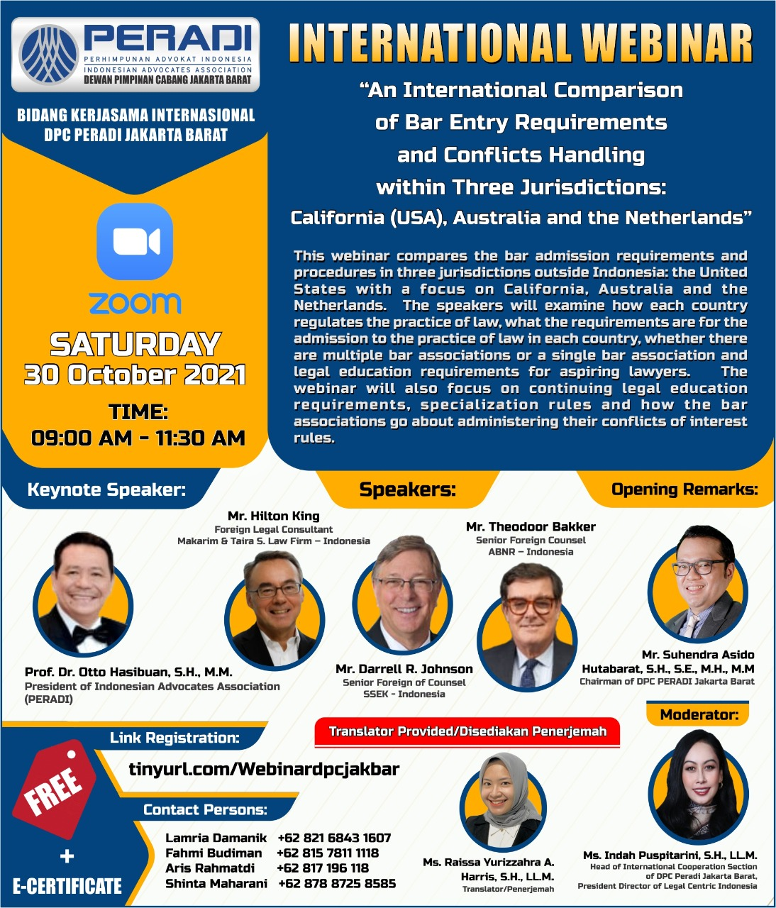 • Dear Fellow Advocates and Future Advocates, Save the Date for an International Webinar, organized by International Cooperation Section of DPC PERADI Jakarta Barat: